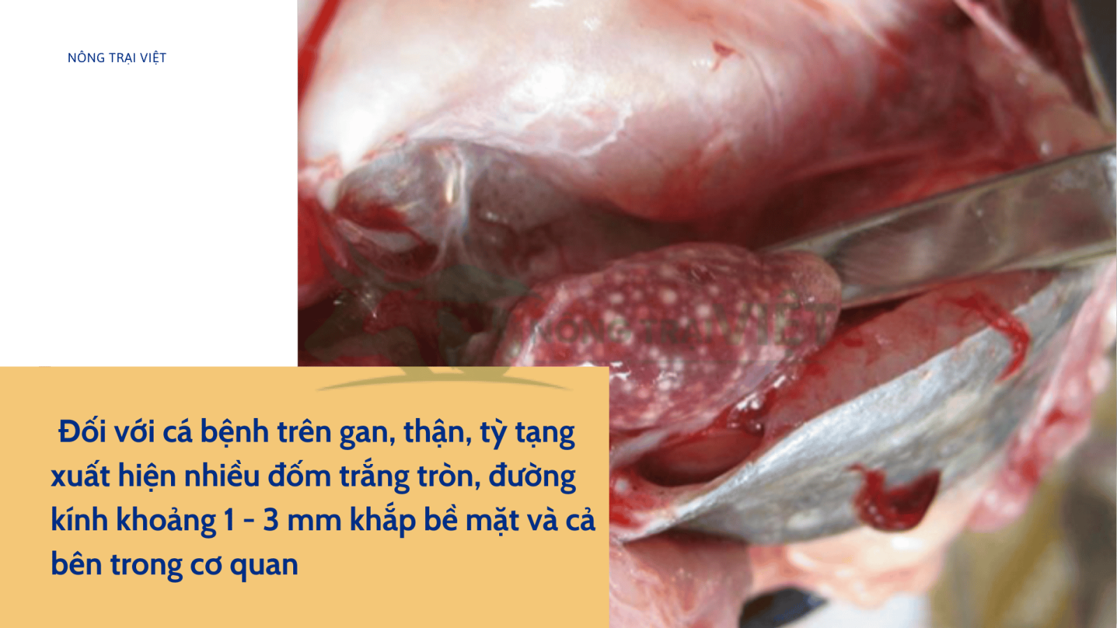 Gan–thận–tỳ tạng có nhiều đốm trắng tròn 1–3 mm trên bề mặt và bên trong, chứa dịch hơi đặc; cấy đốm trắng lên thạch ~24 giờ thường thấy khuẩn lạc rõ.