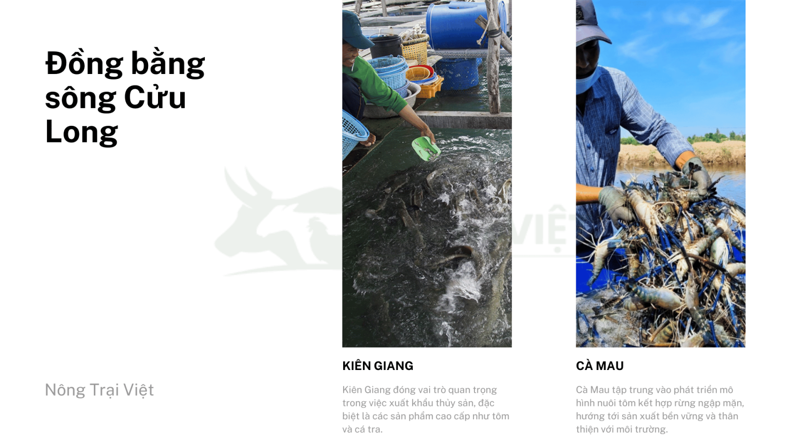 Đồng bằng sông Cửu Long | Cá tra, tôm | Trung tâm lớn nhất; sản lượng rất cao; trụ cột xuất khẩu |