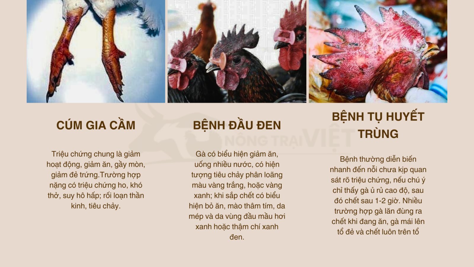 - Hành động: liên hệ thú y địa phương ngay; cách ly chuồng; tiêu độc khử trùng theo hướng dẫn; tuyệt đối không di chuyển/buôn bán gia cầm nghi bệnh.