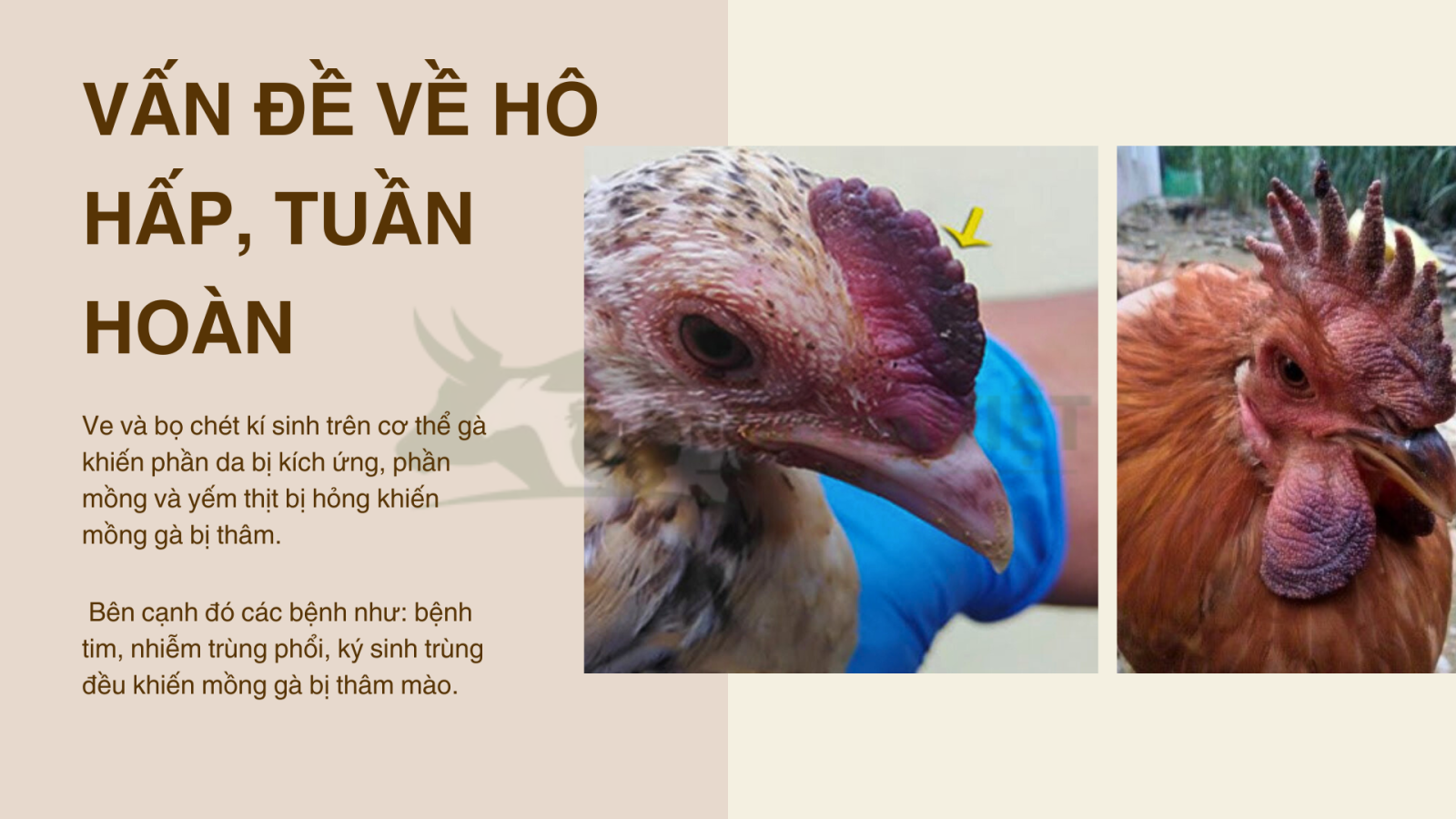 Thiếu oxy, NH3 cao, CRD, stress nhiệt hoặc rối loạn tim–phổi → máu kém oxy hóa làm mào tím thâm; ve/bọ chét kích ứng vùng mào–tích khiến sẫm màu.
