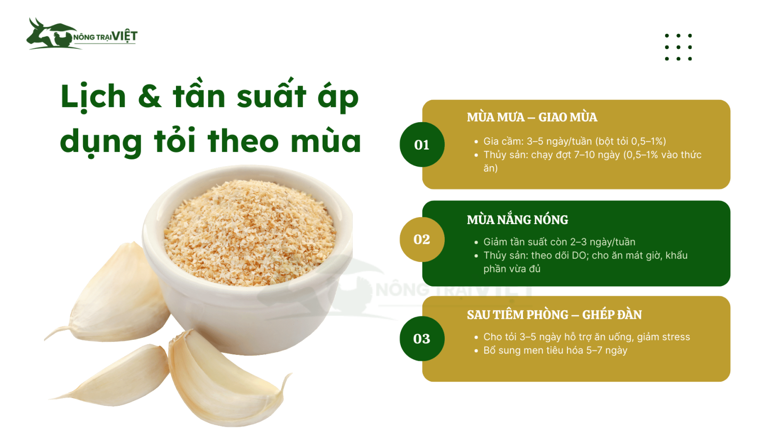 - Gia cầm: 3–5 ngày/tuần (bột tỏi 0,5–1%).