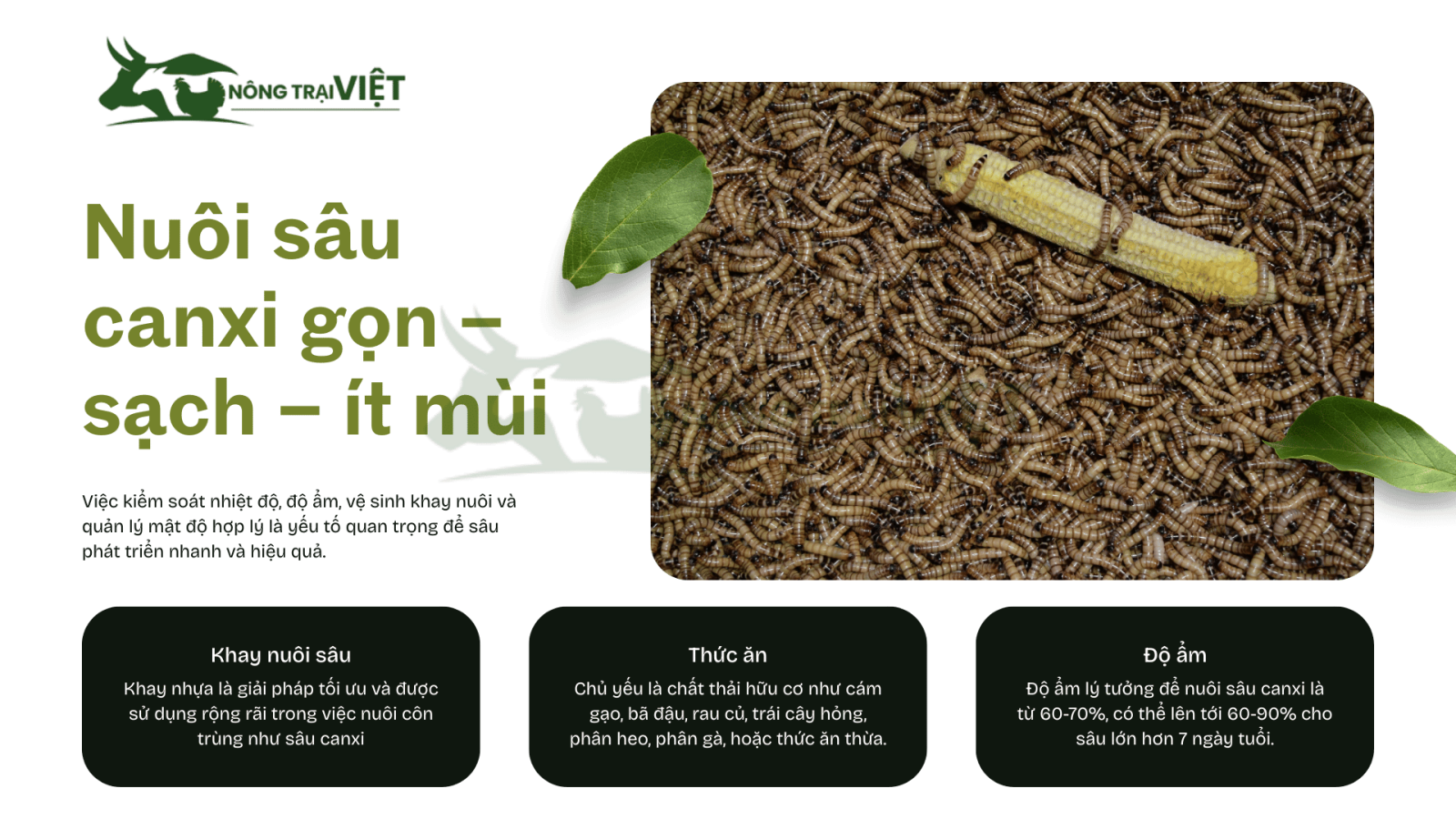 Nông Trại Việt giới thiệu giải pháp nuôi sâu canxi giúp giảm 40–50% chi phí thức ăn, cải thiện tăng trưởng và chất lượng đàn gà. Hướng dẫn phối trộn 10–25%, quy trình nuôi sạch, an toàn sinh học và danh mục gà giống khỏe, giao nhanh toàn quốc uy tín.