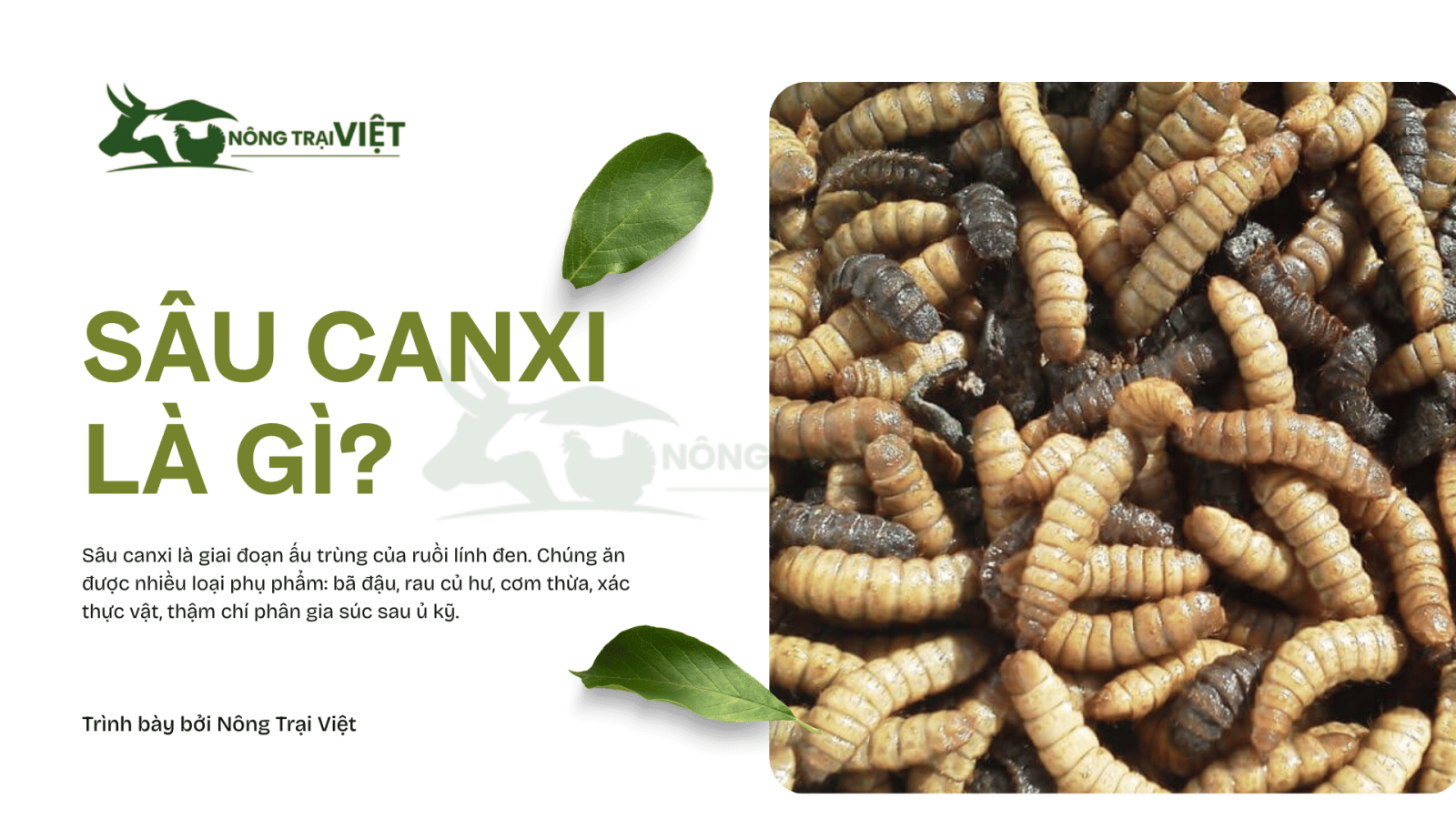 Sâu canxi (ấu trùng ruồi lính đen) giúp tận dụng phế phẩm để bổ sung đạm – béo tự nhiên. Kết hợp cùng gà giống khỏe Nông Trại Việt có thể giảm 40–50% chi phí và rút ngắn thời gian nuôi.